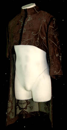 Featured in the Star Trek: Deep Space Nine episode “Inter Arma Enim Silent Leges” during scenes involving the ‘Romulan' Continuing Committee, this cropped over coat is made to be worn on the shoulders and arms. It features a purple patterned fabric with a black nylon interior and snaps and clasps … |