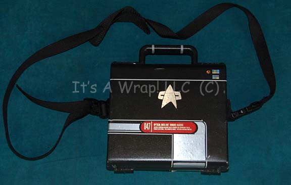 A Starfleet carry case created for Star Trek episodic television and feature films. The item is injection molded plastic colored black with a molded carry handle that has two lines of gray colored adhesive details wrapped around it, preventing it from opening. Despite this, the item’s original construction undoubtedly allowed … |