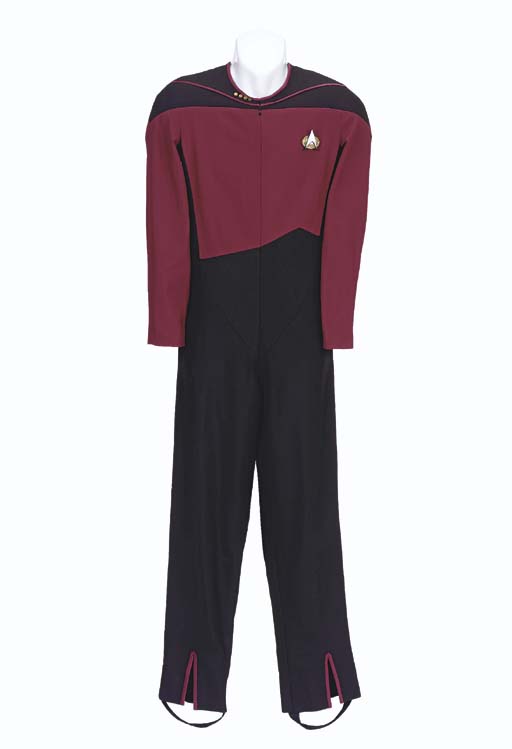 A first season-style Starfleet uniform jumpsuit, with Starfleet communicator badge and four pips on collar indicating the rank of Captain, label inside inscribed <I>40 Patrick 014</I>; with a pair of black leather boots, with label inside inscribed <I>Patrick Stewart</I> -- worn by Patrick Stewart as Captain Jean-Luc Picard in <I>Star … |