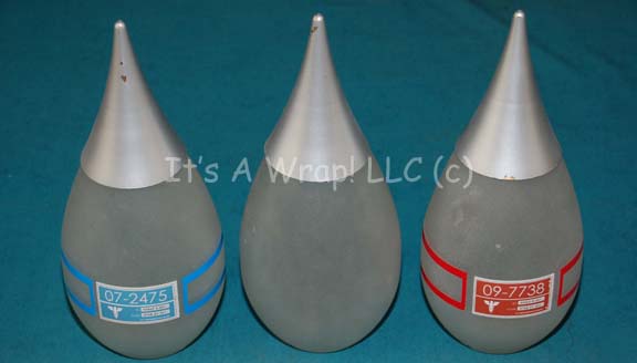 This pair of Xindi simulated control buttons came off of a Xindi console from Star Trek: Enterprise. Made of blue plastic, each ‘button' has a patterned sticker; one green, one blue, that gives it a Xindi appearance. Each measures approx. 2 inches diameter. |