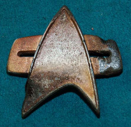 A molded resin Starfleet commbadge made in the style first appearing in Star Trek VII: Generations and in the following films, then going on to appear in Star Trek: Deep Space Nine and Voyager. The item is painted metallic gold and silver and a Velcro patch on the reverse. The … |