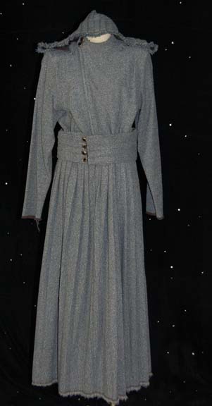 A costume of the style featured in various Star Trek feature films. This costume consists of a full-length, iridescent, deep red robe featuring a design of tiny black and lighter red diamonds that add to the iridescence, large, bell sleeves with red stripes around the cuffs and a similar stripe … |