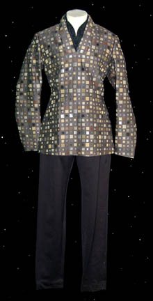 A Romulan fleet uniform worn in Star Trek X: Nemesis comprised of black elastic topped trousers, a silver t-shirt with the collar cut out, a Mandarin style collar bib that ties up the back to be worn under the uniform jacket featuring a multi-colored, square pattern that zips up the … |