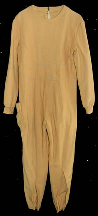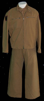 A tan colored Class-D Starfleet Uniform jumpsuit featured in Star Trek I: The Motion Picture. The costume features an open topped pocket on the right thigh, a pair of matching unattached cloth covered shoes, an unattached plastic bio-monitor, a pair of command white division strips for the shoulders, and a … |