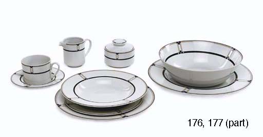 A collection of studio Nova china in the "Exhibition" modern pattern, the twelve place settings each comprising: dinner plate, soup bowl, salad plate, dessert plate, and coffee cup, also including one serving plate, serving bowl, sugar bowl, and creamer -- purchased for the Captain's mess on <I>Star Trek: Enterprise</I> |