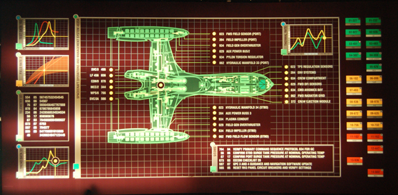 A massive display screen appearing exclusively in the Star Trek: Enterprise episode “First Flight” as one of the two main situation boards in the NX Project mission control. The item is a sheet of smoked acrylic with a multi-colored graphical application adhered to the reverse that is best viewed when … |