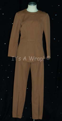 A brown colored Starfleet Class-A uniform like those appearing in Star Trek I: The Motion Picture. The costume is brown trousers with a matching brown uniform top. The item comes with an unattached plastic bio-monitor and a white backed Epsilon IX assignment patch for the left breast that indicates the … |