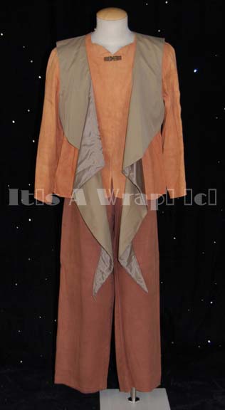 A costume featured in the ninth Star Trek feature film “Insurrection”. This costume is that of a Ba’ku male and consists of a long-sleeved, pumpkin-colored shirt, metal latch at the collar, a gray vest with oversized shirt tails, and brown trousers. A sewn in tag in all three items reads … |