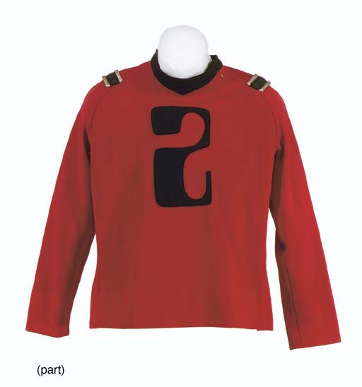 Four red <I>Original Series</I>-style men's Starfleet uniform shirts with black collars, each modified with a large triangular emblem on the chest, three with shoulder tabs and numbers on the back, and one with cuff braid and elaborate epaulettes -- believed to have originally been made for the third season of … |