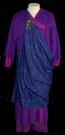 A beautiful robe worn by an alien pilgrim traveling to witness ‘Great Plume of Agosoria' in the Star Trek: Enterprise episode “Cold Front”. The costume is made up of a double breasted purple robe with a blue shoulder hanging wrap with shiny blue embroidered pattern featuring a gold colored ring … |