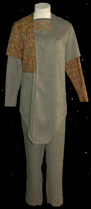 “Chorus 2” (John Schuck) was a member of “Kelis'” (Joseph Will) species who worked with him on a play about “B’Elanna Torres” (Roxann Dawson) and her adventures on the U.S.S. Voyager during the Star Trek: Voyager episode “Muse”. The gray puckered jumpsuit has short sleeves and lacing at the ankles. … |