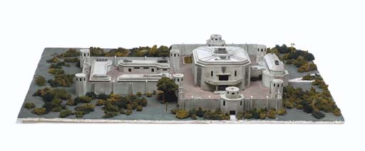 A visual effects model of a Romulan prison camp made from balsa wood, art card, plastic model parts, and lichen trees on a foam board base -- <I>34x48in.</I> -- made for "Birthright" in <I>Star Trek: The Next Generation</I> |