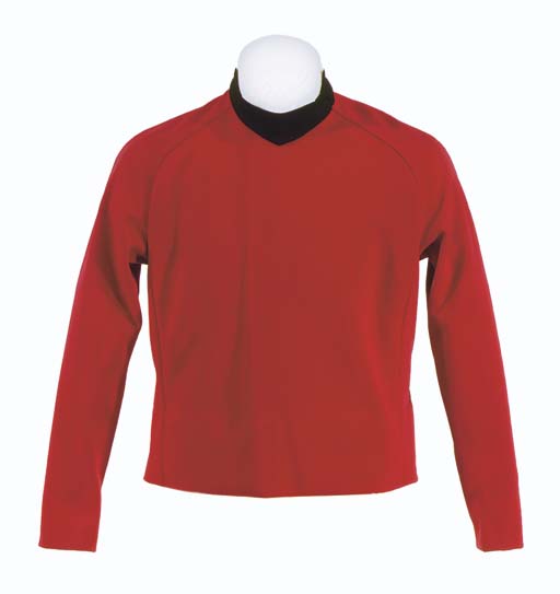 A long-sleeved men's Starfleet uniform shirt of red polyester doubleknit, with black ribbed collar, loose threads on left breast suggest that an insignia was once sewn on -- designed by William Ware Theiss, believed to have been made for <I>Star Trek: Phase II</I> or for the third season of <I>The … |