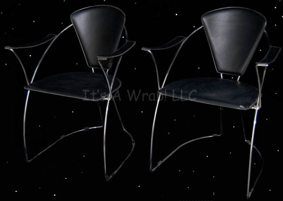 A lot of two side chair made in the style of those appearing in Star Trek feature films. The items are black leather seat and backs with arms all mounted onto a silver colored metal frame. Chairs of this style appeared in Star Trek VIII: First Contact in the captain’s … |