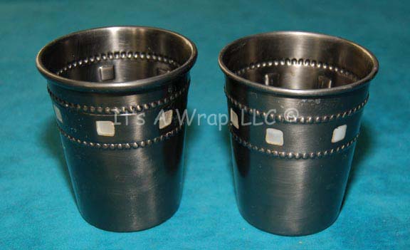 A lot of two metal cups similar to those featured variously in Star Trek episodic television and feature films. This lot consists of two short tumblers, similar to “low ball” glasses, but in a dark-bronze colored metal instead of actual ‘glass’ with two rings of raised dots on the outside … |