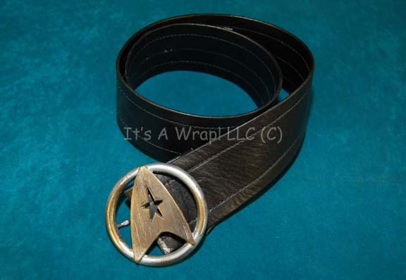A costume accessory appearing in Star Trek feature films from Star Trek II: The Wrath of Khan through Star Trek VI: The Undiscovered Country. The item is a black leather belt with a metal Starfleet emblem buckle. The gold colored paint on the buckle is worn and depicts evidence of … |