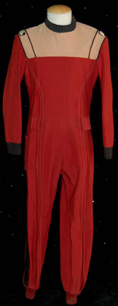 A crewman's uniform of the style appearing in various Star Trek feature films. The costume is a red jumpsuit with black accents and a tan yoke. The costume features affixed white command division strips on the shoulders and a black ribbed collar and cuffs. These unattached elements are also included; … |
