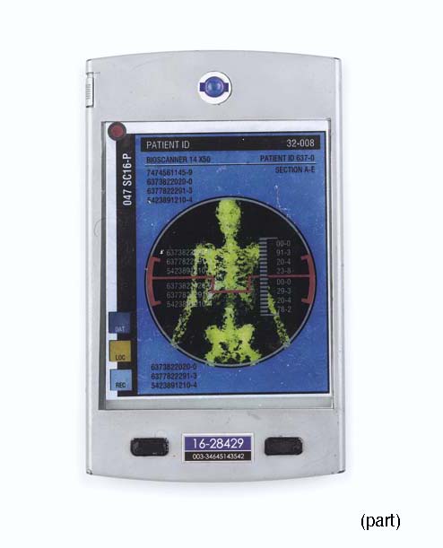 Two prop handheld data screens made from portable slide viewers and a book of replacement screen art, approximately 100 pieces of backlit and frontlit art are included in the book, including medical scans, cargo manifests, transmission logs, alien translations, the text of Jules Verne's <I>From the Earth to the Moon</I> … |