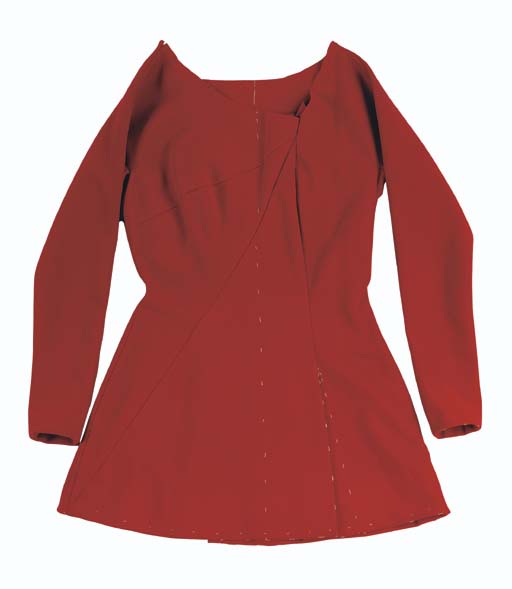 An unfinished woman's <I>Original Series</I>-style Starfleet uniform minidress of red polyester doubleknit, with asymmetrical sunburst body contouring seams, no collar, long sleeves, and invisible zipper in back, designed by William Ware Theiss -- believed to have been made for <I>Star Trek: Phase II</I>, with wardrobe tag inscribed <I>Nichelle Nichols</I> |
