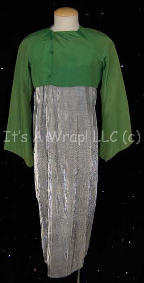 A costume featured in Star Trek VI: The Undiscovered Country for wear by aides to the president of the United Federation of Planets. The costume is composed of reflective silver colored folded over fabric making up a long dress topped with green shoulder straps. Over it is worn a cropped … |