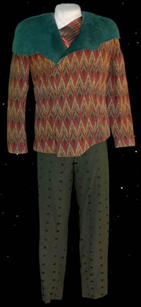 A costume featured in the Star Trek: Deep Space Nine episodes of “One Little Ship” and “Honor Among Thieves” for wear by “Gelnon” (Leland Crooke), a Vorta in the Dominion. The costume is green trousers with dark green square pattern, a plaid patterned undershirt with a pleated collar accent, and … |
