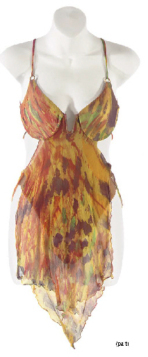 Six costumes, comprising: a rust-coloured military uniform jumpsuit, second version, with belt and communicator; a rust-coloured military uniform jumpsuit, third version, with belt, communicator, and collar pin; a net gown encrusted with pink sequins and beads, with two-tone silver-red chiffon train from "Wrongs Darker Than Death or Night"; a hand-painted … |