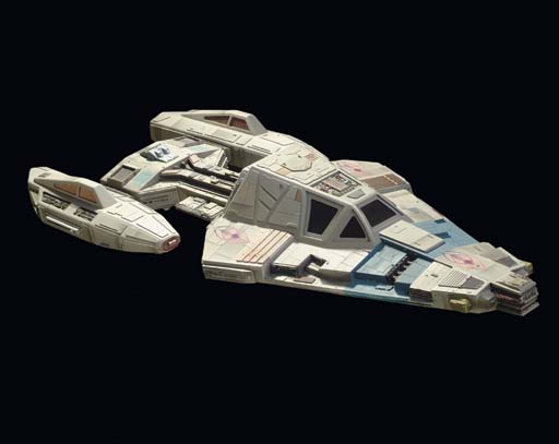 A visual effects model of a modular fighter-sized spacecraft with triangular cockpit, narrow neck, and two engine nacelles -- <I>28x11in.</I> -- originally made as a Talarian ship in "Suddenly Human" in <I>Star Trek: The Next Generation</I> and modified for subsequent service as a Phrygian craft, then a Drayan shuttle |