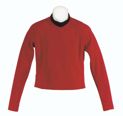 A Starfleet uniform shirt of red polyester doubleknit and black ribbed collar, tagged for Walter Koenig -- designed by William Ware Theiss, intended for use by Walter Koenig in <I>Star Trek: Phase II</I> |