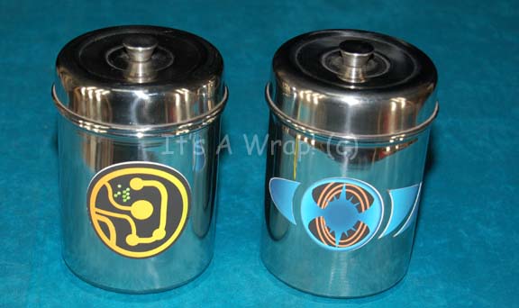 A pair of ‘Sitlax’ name brand stainless steel containers with lids appearing variously in episodes of Star Trek: Enterprise in the sickbay set of “Dr. Phlox” (John Billingsley). The items are containers of differing sizes, each with multi-colored graphical applications adhered to the exterior depicting alien iconography. The items measure … |