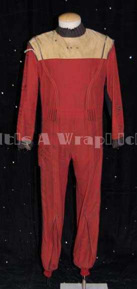 A costume similar to those featured in various Star Trek Feature Films from “The Wrath of Khan to the opening scenes of “Generations”. This costume consists of a long-sleeved, full-length red jumpsuit featuring tan shoulders, a black, ribbed collar and cuffs, black piping, a wide black stripe along the inner … |