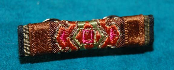 A Starfleet officer’s campaign ribbon created for Star Trek VI: The Undiscovered Country and of the style appearing in Star Trek VII: Generations. The item is fabric covered sheet plastic with twin pin backs. The item is colored gold with red-orange flairs around a lime green center all flanked by … |