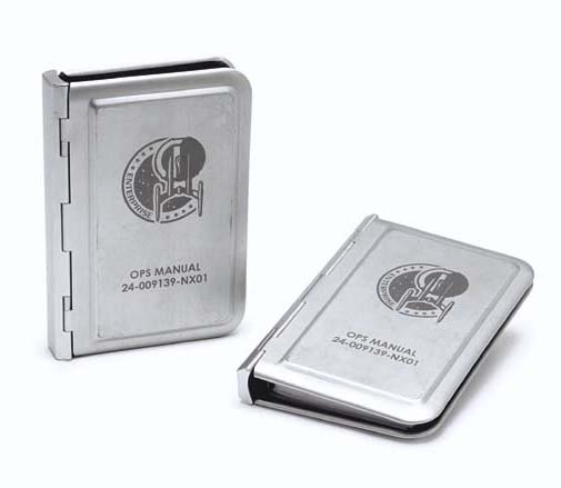 Two small aluminum binders with several prop pages, made from six-ring date/address binders, front cover silkscreened in grey with the <I>Enterprise</I> mission patch, and title reading <I>Ops Manual, 24-009139-NX-01</I>, Velcro patches on back covers secured these props to the set -- <I>7½x5¼x1in.</I> -- used on the bridge set throughout all … |