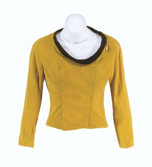 A woman's pilot-style Starfleet uniform shirt made of mustard-gold velour with black collar -- made for the <I>Star Trek</I> pilot episodes, then subsequently modified, with the addition of the black collar, for use in the regular series episodes |