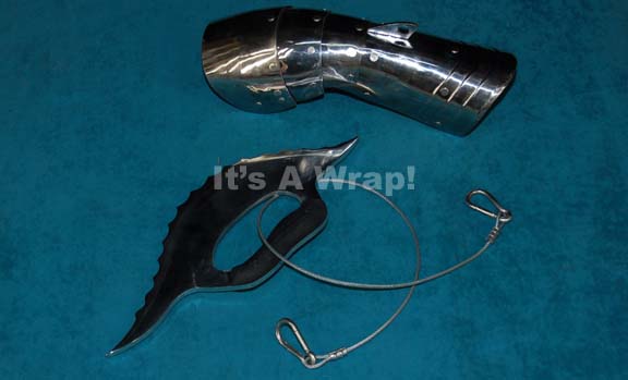 A lot consisting of an Andorian Ushaan-tor and plate armor gauntlet like those appearing in the Star Trek: Enterprise episode “United” for use by “Captain Archer” (Scott Bakula) or “Shran” (Jeffrey Combs). The item is machined and polished metal with a wood hand grip painted black on a beveled edge … |