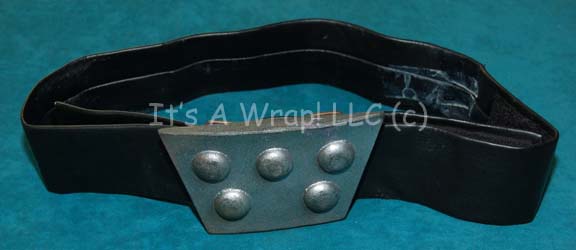 A costume accessory appearing in Star Trek feature films and episodic television, a Klingon belt and buckle. The item is black vinyl with a resin buckle painted metallic silver with five metallic gold colored ‘studs' and a pair of wire loops molded into the reverse. The belt measures approx. 41.5 … |