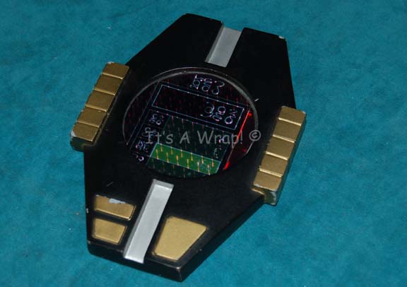 A prop Klingon communicator like the one worn by “Gowron” (Robert O’Reilly) in the Star Trek: The Next Generation episode “Redemption”. The item is a molded resin hexagon with an elongated top and bottom, featuring raised triangular faux buttons and a raised emblem of the Klingon Empire. The reverse features … |
