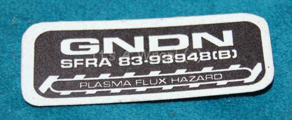 An unused Starfleet inventory application believed to have been created for episodes of Star Trek: Enterprise. The item is a small adhesive label reading ‘GNDN’ and ‘SFRA’ with ‘PLASMA FLUX HAZARD’. ‘GNDN’ is a commonly reoccurring acronym appearing variously in Star Trek episodic television and feature films used to make … |