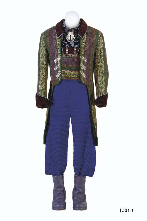 Four costumes made for Armin Shimerman as Quark in <I>Star Trek: Deep Space Nine</I>, comprising: Quark's "stained glass" suit comprising a jacket, vest, shirt, and dark blue velour jumpsuit; Quark's "purple zebra stripe" suit comprising a jacket, four shirts, two jumpsuits, and one pair purple boots; Quark's green/orange silk brocade … |