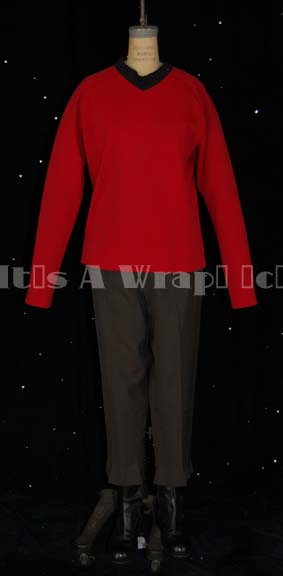 A Starfleet uniform composed of several differing components from a variety of eras. One piece is an operations red Starfleet uniform shirt with long sleeves, a black collar, an invisible zip seam along the left shoulder line, with an inverted reflective silver triangle sewn onto the back. This top may … |