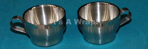 A lot of two stainless steel hot beverage mugs like those appearing variously in Star Trek episodic television. The items feature handles and polished rims measuring approx. 2.25 X 3.25 X 2 inches diameter and are believed to have appeared in episodes of Star Trek: Enterprise. |