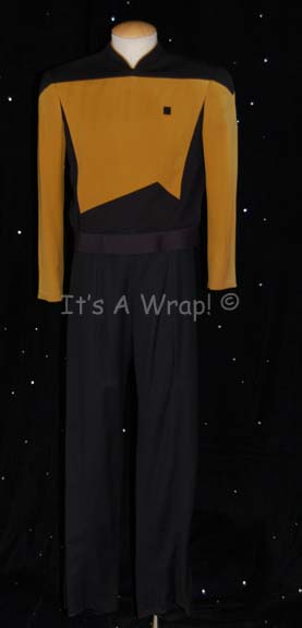A Starfleet uniform like those appearing in episodes of Star Trek: The Next Generation. The costume is a set of black trousers and an operations gold uniform top that zips up the spine with a mandarin style collar. The trousers feature a sewn in Star Trek VII tag and the … |
