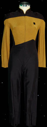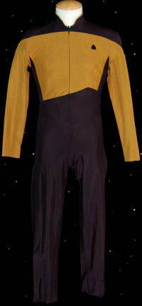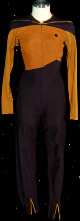 A Starfleet operations gold uniform in the third season style made for wear on the Star Trek: The Next Generation series. The jacket is gold and black with gold trim around the collar. It has a zip and snaps up the back and a small Velcro patch on the front … |