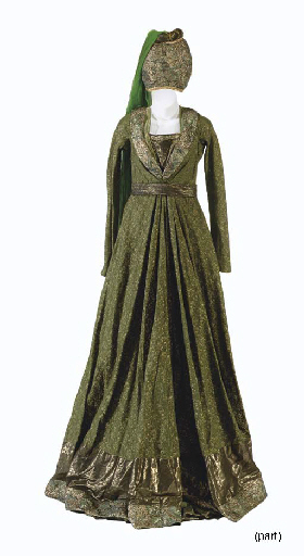 Four costumes, comprising: a green and black Starfleet dress uniform jacket; a blue and black future Starfleet uniform jumpsuit with future Starfleet insignia from "The Visitor", (label indicates subsequent use by another performer on <I>Star Trek: Voyager</I>); a maroon stretch nylon full-length tunic and matching pants from "Equilibrium"; and a … |