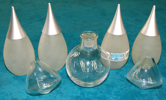 A lot of glassware set dressings featured in various episodes of Star Trek: Enterprise. These items were used to hold sundry liquids and include two glass top-shaped receptacles, a spherical receptacle with a stopper and Starfleet inventory sticker, and four teardrop-shaped, frosted glass bottles with silver-colored lids; one such bottle … |