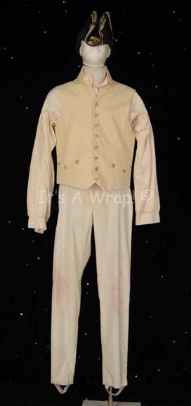 A stunt costume created for the character of “Worf” in Star Trek VII: Generations. The costume is a set of white pantaloons, a white long sleeved button front shirt, and a cream colored button front vest, and a giant black felt hat with a fabric outer lining that is adorned … |