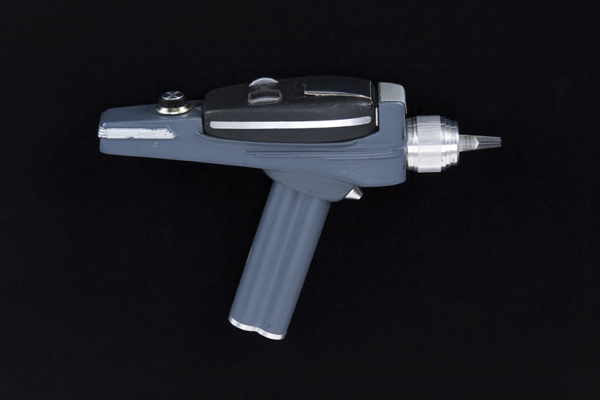 (Paramount, 1977) This meticulously assembled aluminum production model was made for <em>Star Trek: Phase II</em>, the ill-fated follow-up to the classic <em>Star Trek</em> series. Constructed in three pieces: the main body, the Phaser 1 hand-held unit, and the handle/energy-pack mostly in aluminum, with machined acrylic tip and various gauges and … |