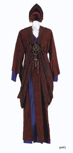 Four costumes made for Vedeks or other Bajoran religous leaders in <I>Star Trek: Deep Space Nine</I>, comprising: Vedek's costume with rust colored gown, robe, coif, and two elaborate hats; a green and grey Vedek's costume with jumpsuit, pants, tabbard, hat, and accessories, including plated metal Bajoran symbol buckle; Kai Winn's … |