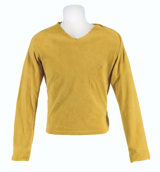 A gold/mustard velour original series pilot-style Starfleet uniform top, collar is not present, and a slit up the back, indentations in fabric suggest a single straight band rank cuff band was once displayed on this costume, and two sets of indentations on chest fabric suggest that pilot-version and series-version <I>Enterprise</I> … |