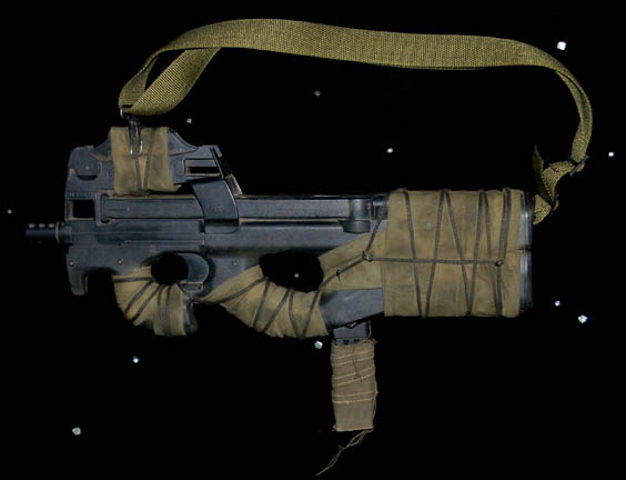 A prop machine gun used in Star Trek X: Nemesis by the ‘Kolarans' during the ARGO chase sequence. This molded rubber prop replica of an ‘FN Herstal P-90’ submachine gun has been modified to appear alien with olive drab fabric wrapped around several components and tied on with black rope … |
