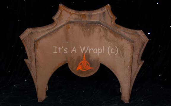 A formed wood framed chair back created for episodes of Star Trek: Deep Space Nine. The item is made with a Klingon theme and includes adhered logos of the Klingon Empire on both the face and reverse. The item is painted brown and distressed to appear ‘aged’. The remains of … |